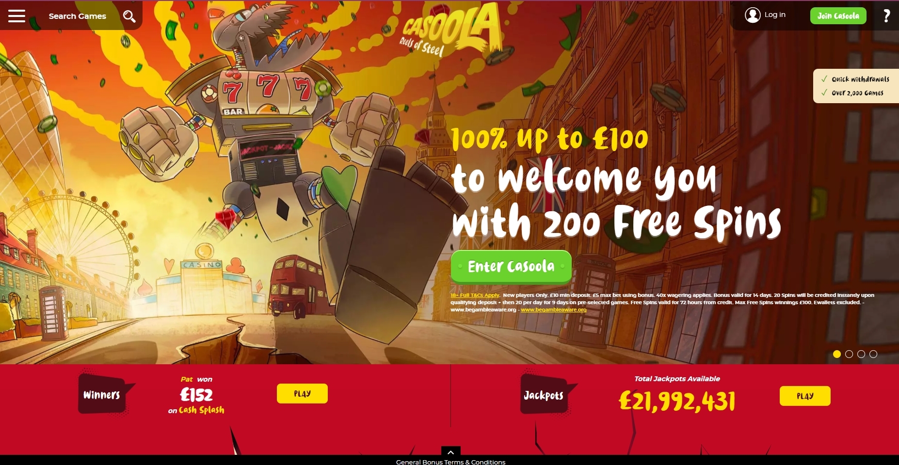 Casoola on mobiililähtöinen kolikkopeli- ja kasinosivusto, joka tarjoaa valtavan pelivalikoiman, hyvän valikoiman maksuvaihtoehtoja Iso-Britannian pelaajille ja nopeat nostoajat. Sivusto on täynnä luonnetta, ja sitä johtaa joukko sarjakuvarobotteja, kuten Wiktoria ja Sgt John Tango (alias JT), jotka ovat tyyliltään samanlaisia kuin Futurama, joten yleisilme ja -tuntu on erilainen kuin perinteisillä online-kasinoilla. . Kevyestä tyylistä huolimatta tämä on vakava kolikkopelisivusto, jossa on yli 1300 peliä johtavilta tuottajilta, kuten NetEnt ja Microgaming, sekä putiikkistudiot, kuten Push Gaming ja Skywind. Genesis Global Limitedin ylläpitämä Casoola Casino on Malta Gaming Authorityn ja UK Gambling Commissionin lisensoima ja tarjoaa pelaajille turvallisen pelikokemuksen kaikilla alustoilla.